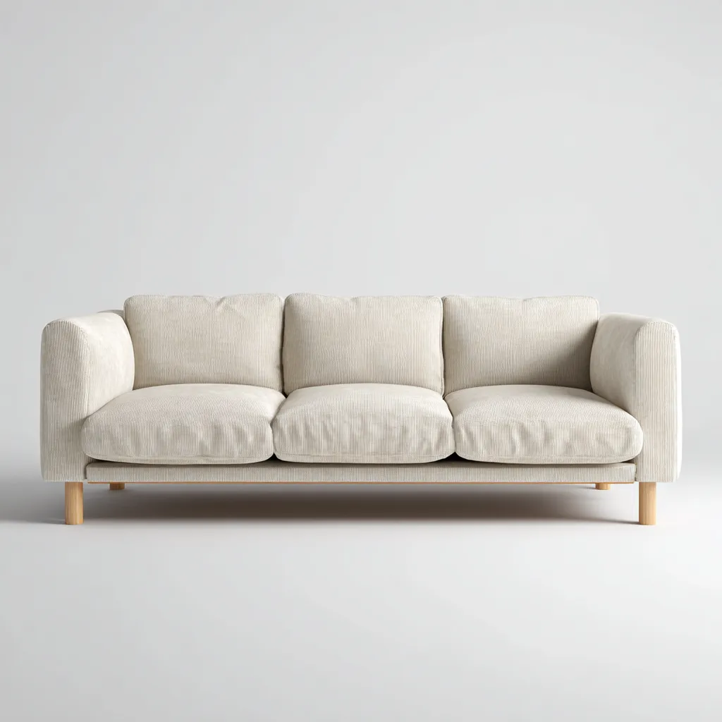 Le canapé est recouvert d'un tissu beige à texture douce et homogène. Les coussins d'assise présentent une finition soignée avec des coutures régulières, tandis que la base repose sur des pieds en bois clair assurant stabilité et élégance.