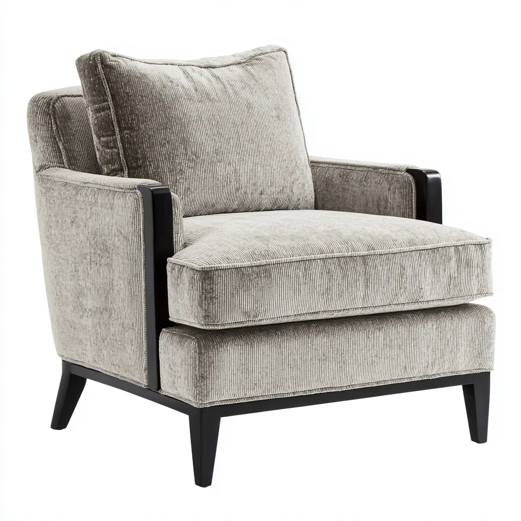 Ce fauteuil en tissu texturé est conçu pour offrir une assise confortable et accueillante dans le salon. Son design aux lignes équilibrées s'intègre facilement dans un intérieur contemporain.